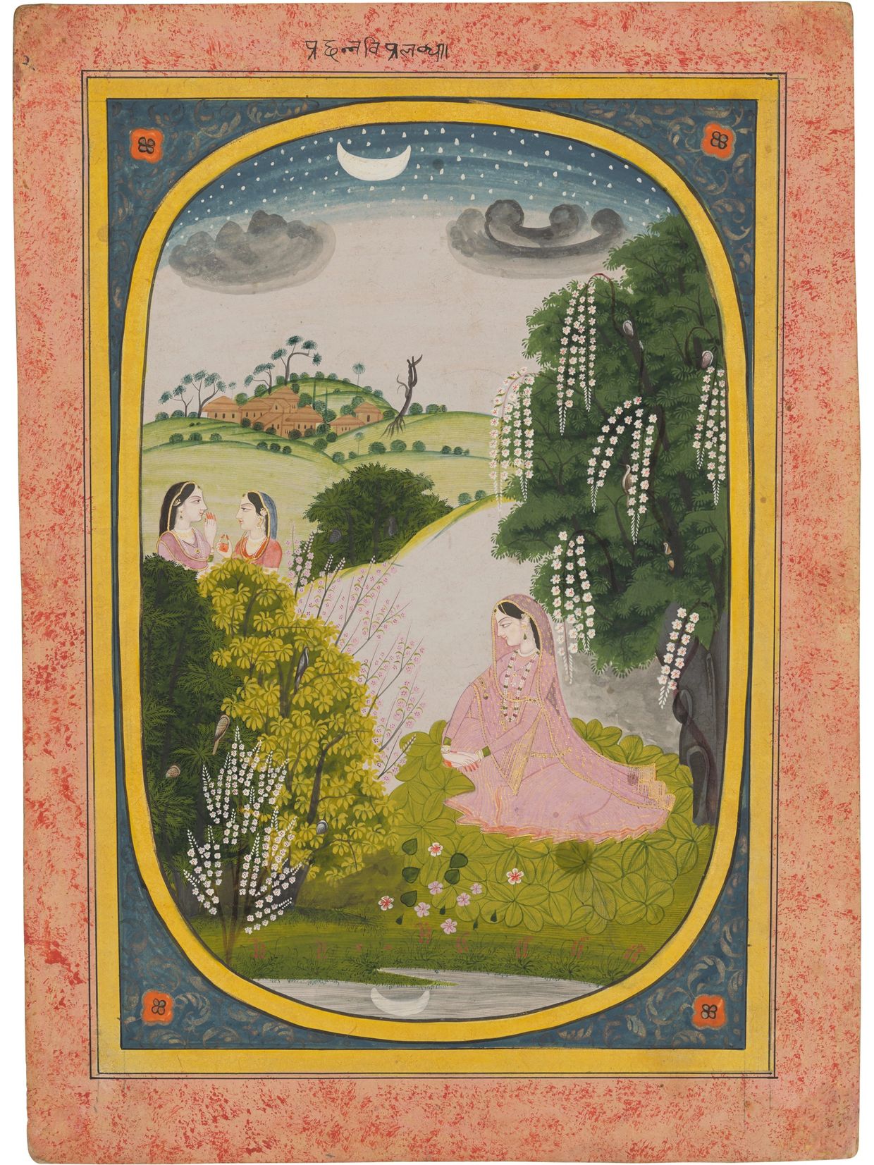 This painting is inscribed with verses from the Rasikapriya of Keshav Das. Keshav Das, a Brahmin from Orchha in Bundelkhand, was the court poet of Raja Madhukar Shah of Orchha (r.1554-1592). He wrote his famous love poem Rasikapriya in 1591. The Rasikapriya analysed the various types of lover, with special reference to Radha and Krishna and seems to have been a favourite with Kangra painters.