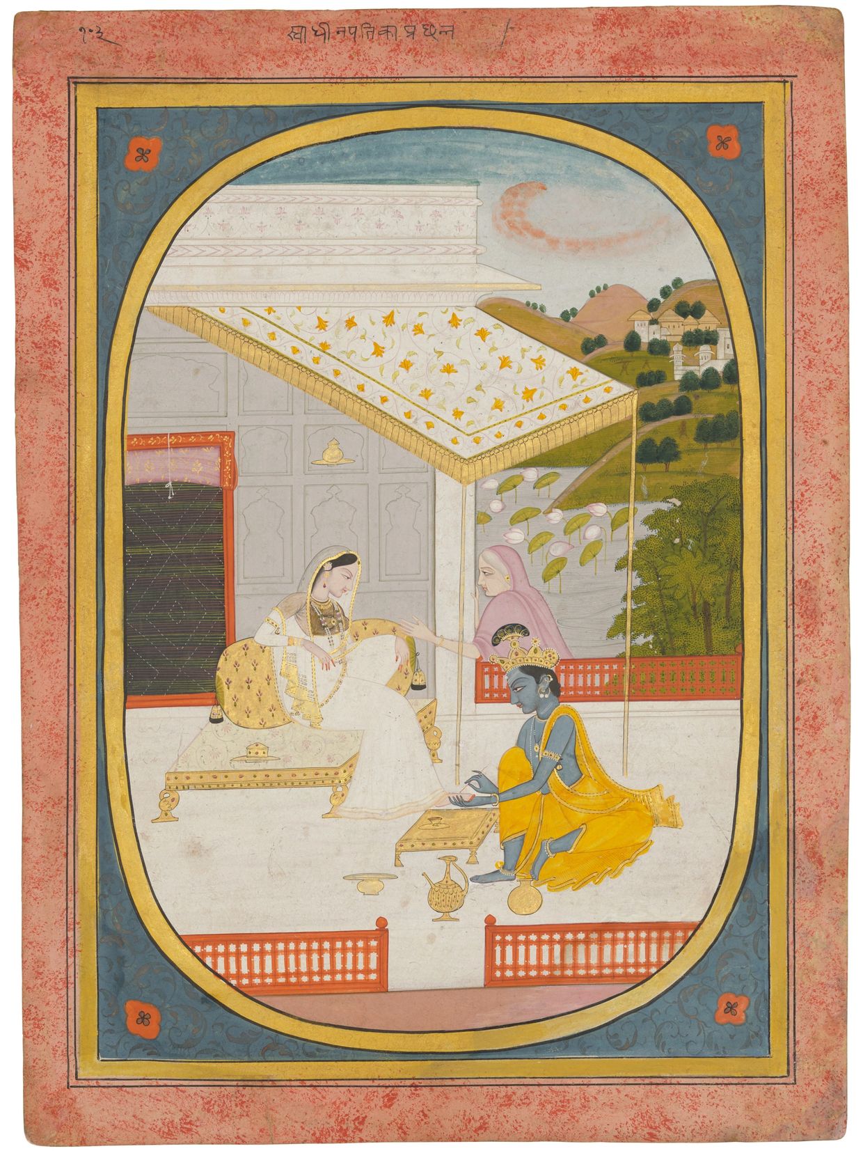 In this exquisite painting, Radha leans against a gold woven bolster. She wears white garments and a diaphanous white odni with gold trims over a gold bodice. Her sakhi, appearing from behind the terrace balustrade, talks to her, commenting on Krishna’s action. The god lifts Radha’s foot from the footstool and holds it in his hand. With a brush, he applies a red dye called mahavar to the foot. Mahavar (also known as alta) is traditionally made from betel leaves and applied to the hands and feet of women during festivals or marriage ceremonies.